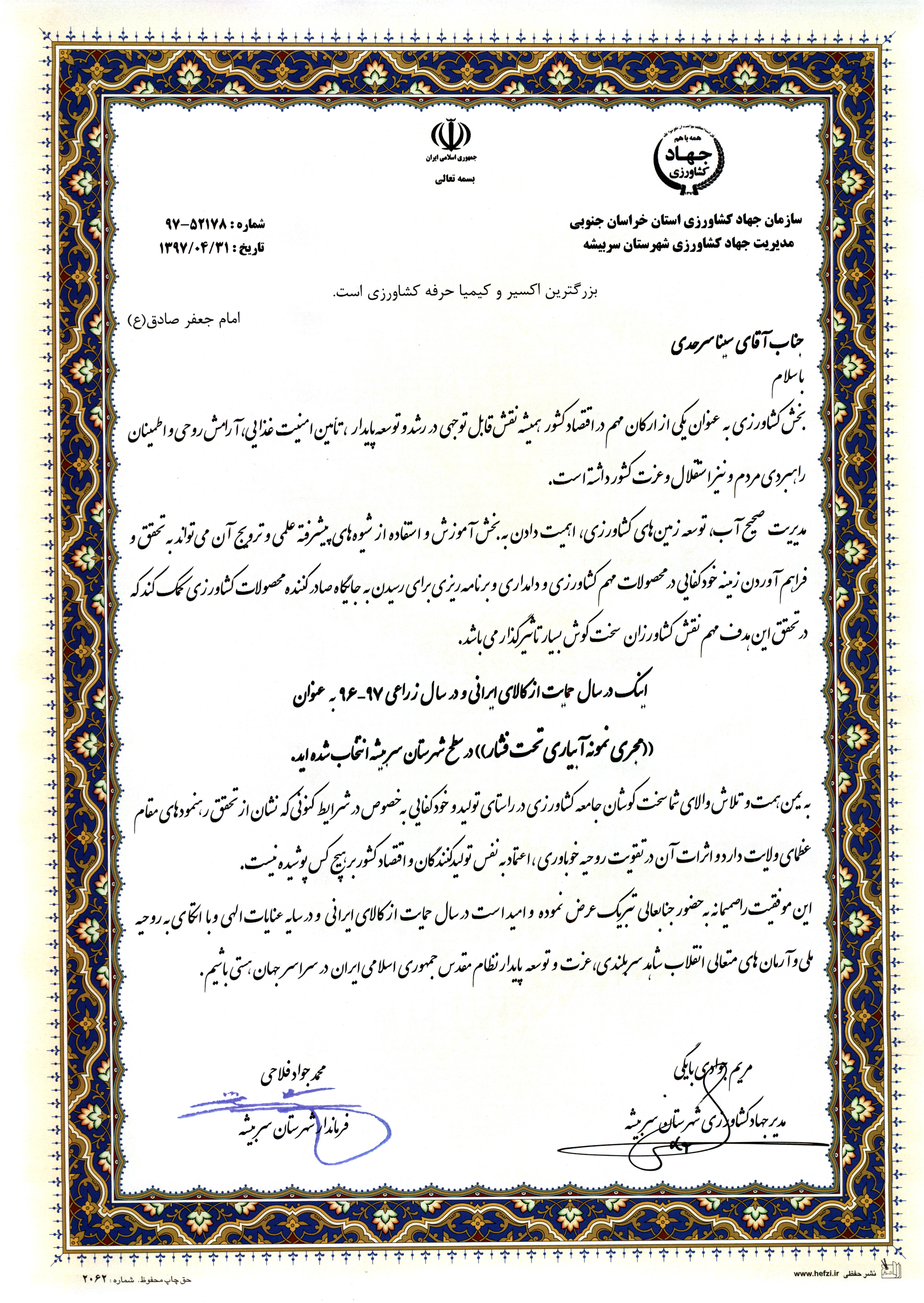 شرکت کشت و صنعت پیوند خاوران به پاس انجام اقدامات مناسب در اجرای سیستم های آبیاری تحت فشار در سال زراعی ۹۶- ۹۷ از سوی سازمان جهاد کشاورزی استان و فرمانداری شهرستان سربیشه مورد تقدیر قرار گرفت.