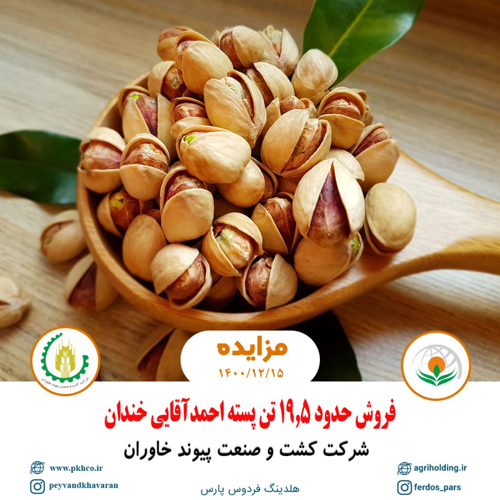 شرکت کشت و صنعت پیوند خاوران در نظر دارد مقدار حدودی ۱۹٫۵ تن پسته (به شرح ذیل) خود را از طریق مزایده عمومی که در ساعت ۱۲:۰۰ روز یک شنبه مورخ ۱۴۰۰/۱۲/۱۵ برگزار خواهد شد به فروش برساند. متقاضیان می توانند جهت اخذ و تحویل فرمهای مربوطه به دفتر شرکت واقع در بیرجند کیلومتر ۵ جاده بیرجند کرمان جنب دانشکده کشاورزی یا به سایت شرکت www.pkhco.ir مراجعه نمایند.